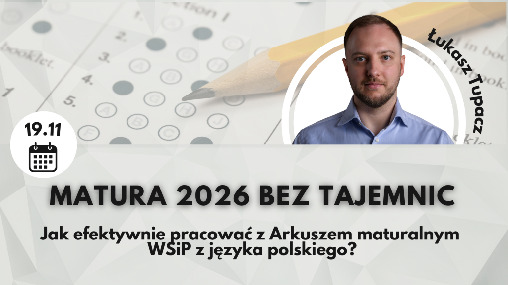 Zapraszamy na bezpłatny webinar: Matura 2026 bez tajemnic. Jak efektywnie pracować z Arkuszem maturalnym WSiP z języka polskiego?, podczas którego dr Łukasz Tupacz – nauczyciel, egzaminator i doradca metodyczny – podzieli się swoim doświadczeniem oraz praktycznymi wskazówkami, dotyczącymi przygotowania uczniów do matury z języka polskiego w Formule 2023.