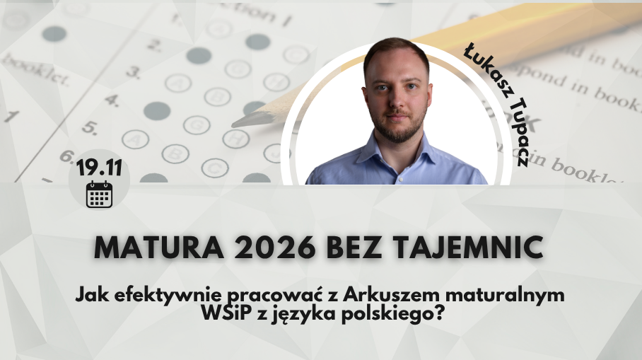 Zapraszamy na bezpłatny webinar: Matura 2026 bez tajemnic. Jak efektywnie pracować z Arkuszem maturalnym WSiP z języka polskiego?, podczas którego dr Łukasz Tupacz – nauczyciel, egzaminator i doradca metodyczny – podzieli się swoim doświadczeniem oraz praktycznymi wskazówkami, dotyczącymi przygotowania uczniów do matury z języka polskiego w Formule 2023.